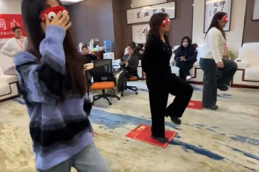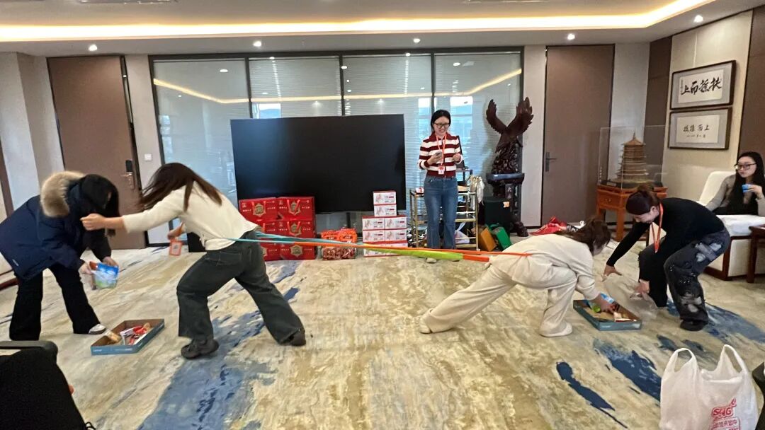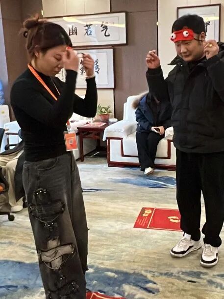 接下来,“蒙眼踏步”游戏考验着参赛者的默契和方向感。参赛者蒙住眼睛,在激情澎湃的音乐声中,在规定区域内努力完成踏步任务。看似简单的动作,却充满了挑战。 最激烈的环节当属“南北拉力绳抢零食”。参赛者腰系拉力绳奋力向前,队友眼疾手快接住零食。这不仅是一场力量的对决,更是团队协作的生动演绎。呐喊声、欢笑声交织,将气氛推向高潮。